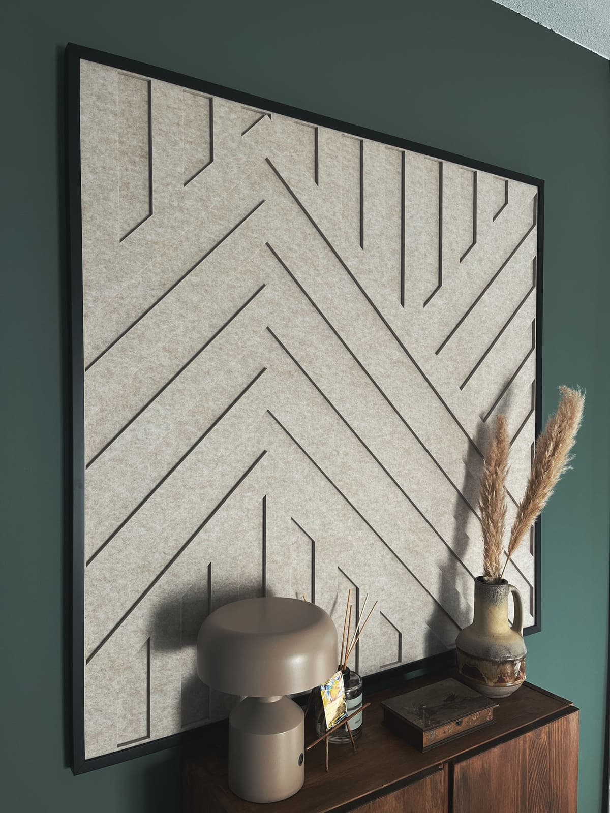 Wo früher die Akustik unauffällig versteckt wurde, darf sie jetzt sichtbar sein. Denken Sie an auffällige Wandpaneele in einzigartigen Formen, grafische Drucke oder künstlerische akustische Paneele aus Filz. Damit lösen Sie nicht nur ein akustisches Problem, sondern verleihen dem Raum auch Charakter.