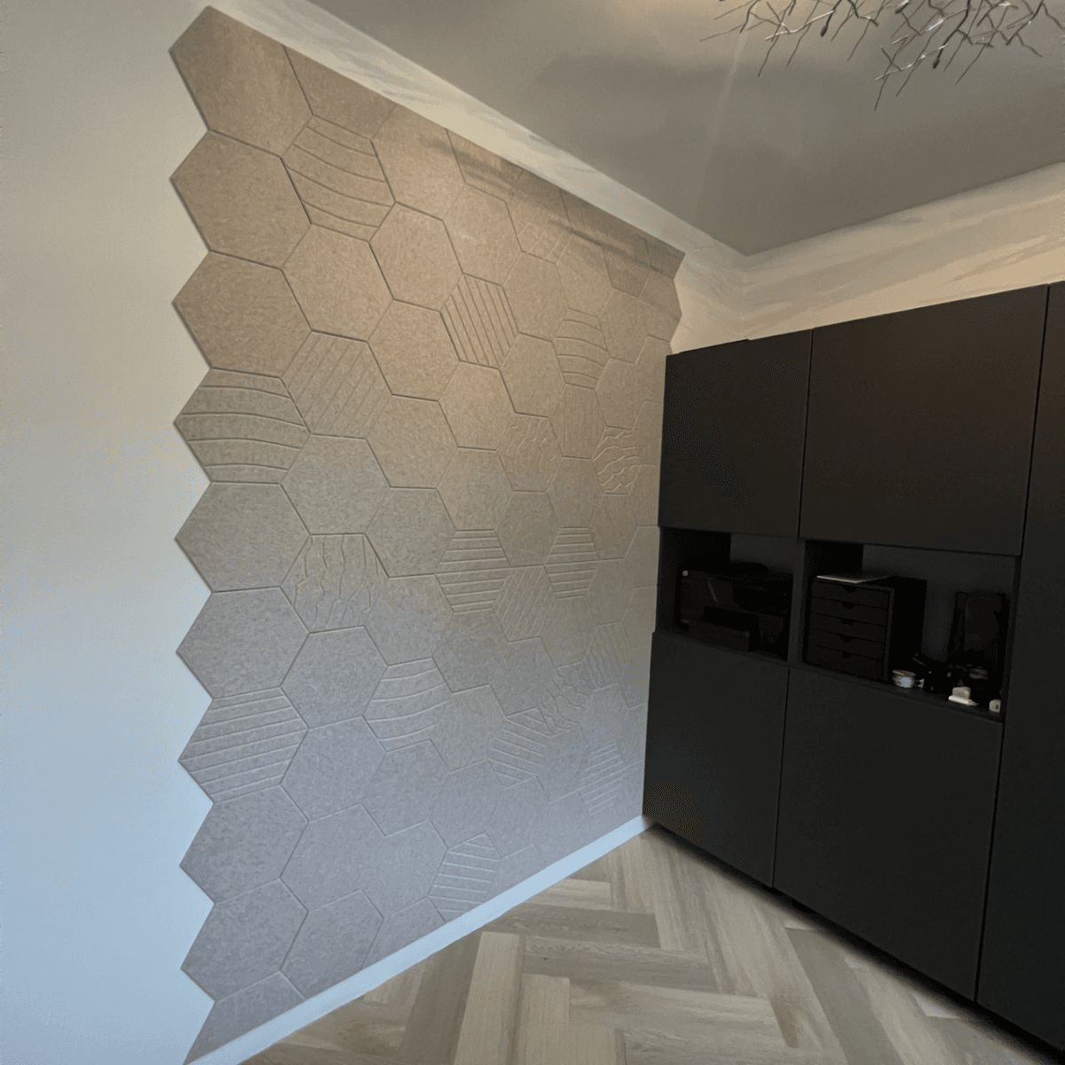 PET-Filz hat eine einzigartige Textur, die dem Raum eine stilvolle und warme Atmosphäre verleiht. Dank der breiten Auswahl an Farben, Oberflächen und Formen kannst du es vollständig an dein Design anpassen. Mit PET-Filz kannst du zudem mit Formen und Mustern spielen, sodass es nicht nur funktional, sondern auch ein echter Blickfang in deinem Interieur wird. Egal, ob du dich für subtile neutrale Töne oder ein auffälliges Muster entscheidest, die Möglichkeiten sind endlos.